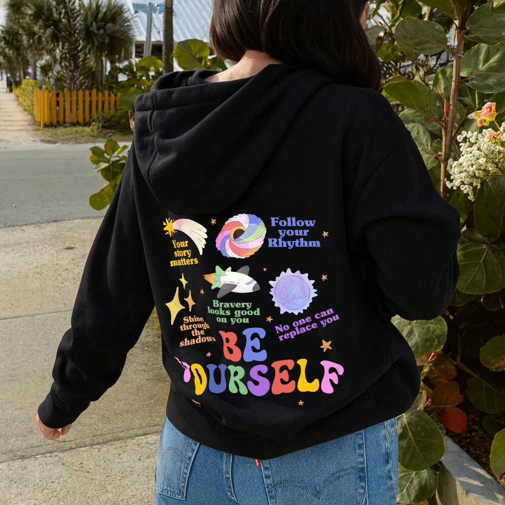 The Be Yourself Hoodie is a colorful reminder to stay true to who you are. Playful, expressive, and full of heart, it's more than a cozy layer—it's a celebration of individuality. Each message and symbol is designed to encourage confidence, self-expression, and gentle self-belief, whether you're out in the world or enjoying a quiet moment to yourself. Soft, comfortable, and made to inspire, this hoodie helps you wear your values proudly and spread a little light wherever you go—because being yourself is always enough.